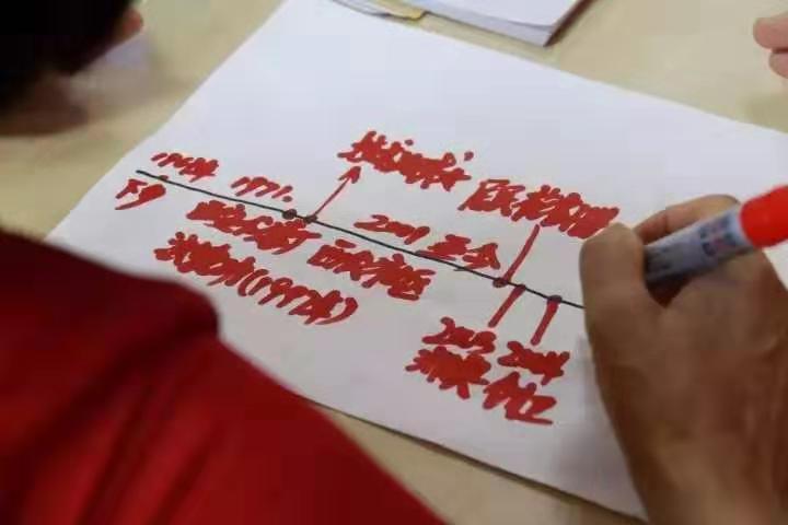 为引导老年人继续回忆自己过往的精彩生活,实践团协助他们绘制了属于自己的生命时间轴。一开始,老人们似乎有些害羞和胆怯,不愿意把自己过去的生活展现出来。为此,实践团不断和老人进行交流,找到他们身上的闪光点,并适时给予赞美,从而增强他们的自我肯定。在这样的鼓励下,老人们越画越有自信,下笔绘制时,眼神含笑,似乎也怀念着自己当年青涩的模样。最后,老人们在时间轴旁饱含深情地签下了自己的姓名。