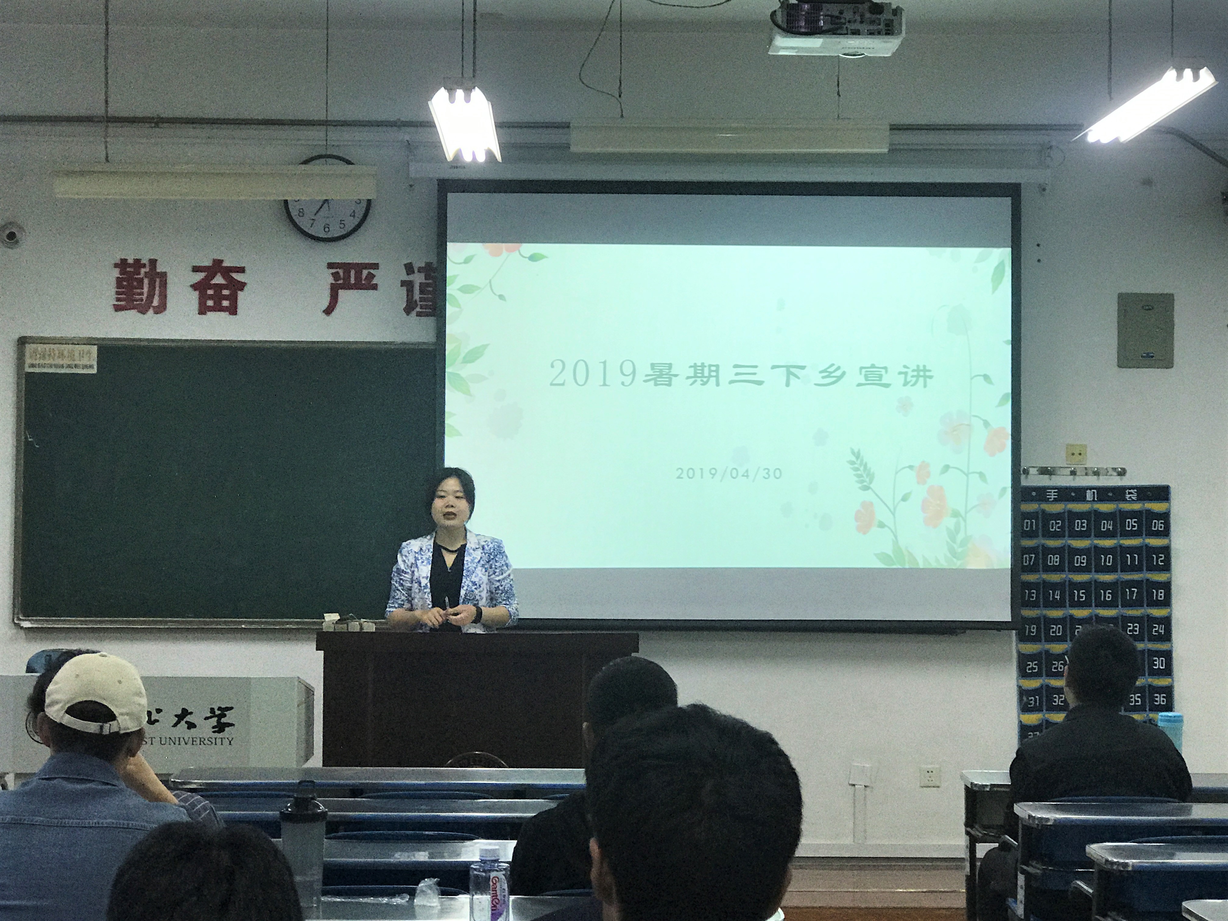 首先,李鑫老师就去年我院三下乡情况进行了大致介绍。她指出,去年我院共派出十一支暑期三下乡团队,并获得了“2018 年暑期社会实践活动优秀组织单位”称号,这是同学们一起努力的结果。之后,李老师为同学们系统地介绍了“三下乡”活动的一些基本情况,使大家了解什么是“三下乡”。