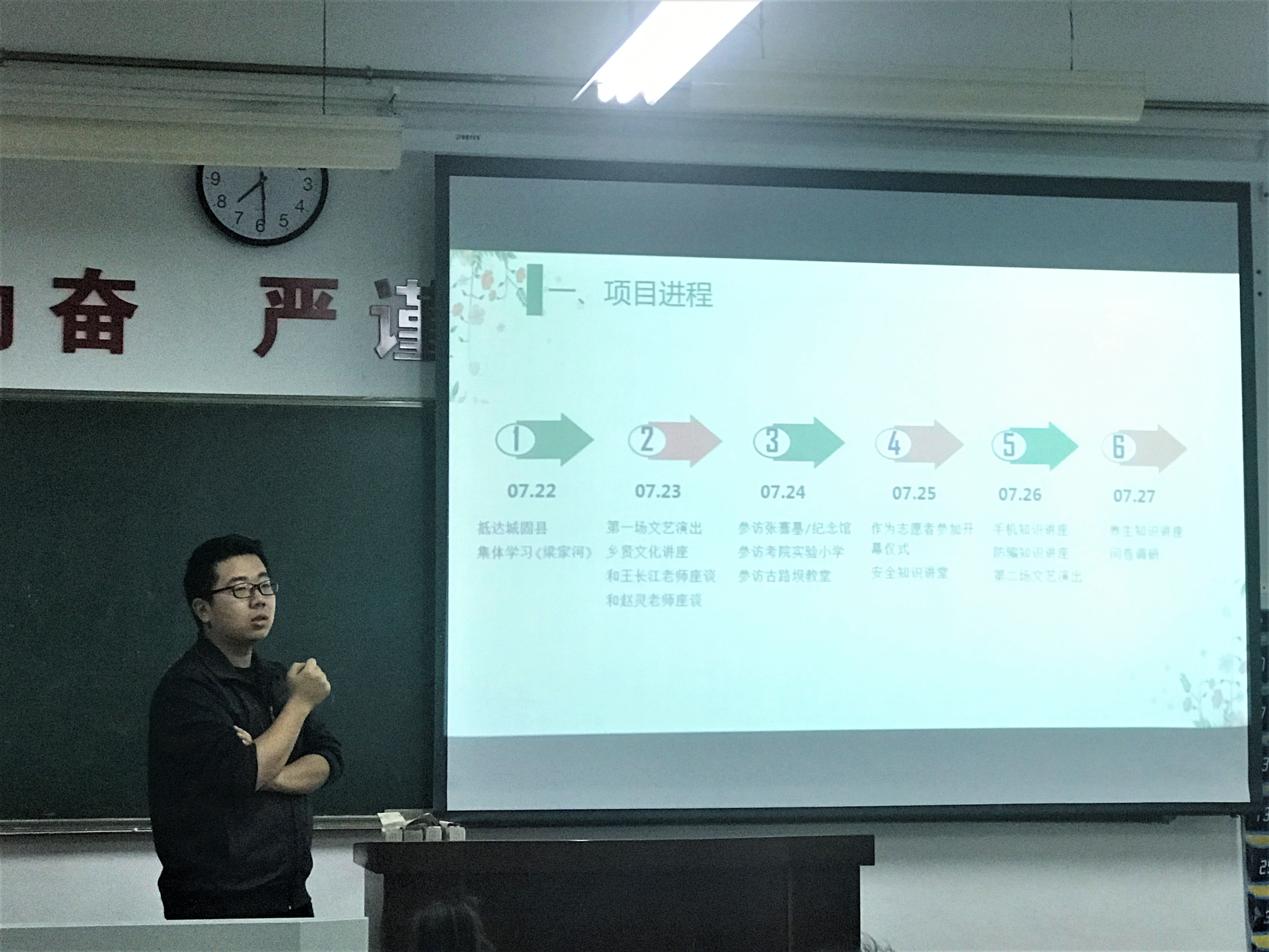 最后一位分享的是院团委副书记吴嘉琦同学,他去年负责了学院团委的三下乡代表队,团队的选题为《文化养老——陪老年人一起上大学》。吴嘉琦同学用生动形象的语言从项目进程、具体活动开展情况、宣传报道等多方面进行了分享。在介绍完本队的情况后,他又立足于今年校团委的暑期三下乡工作计划给同学们提出了合理的建议,并就一些注意事项进行了说明。
