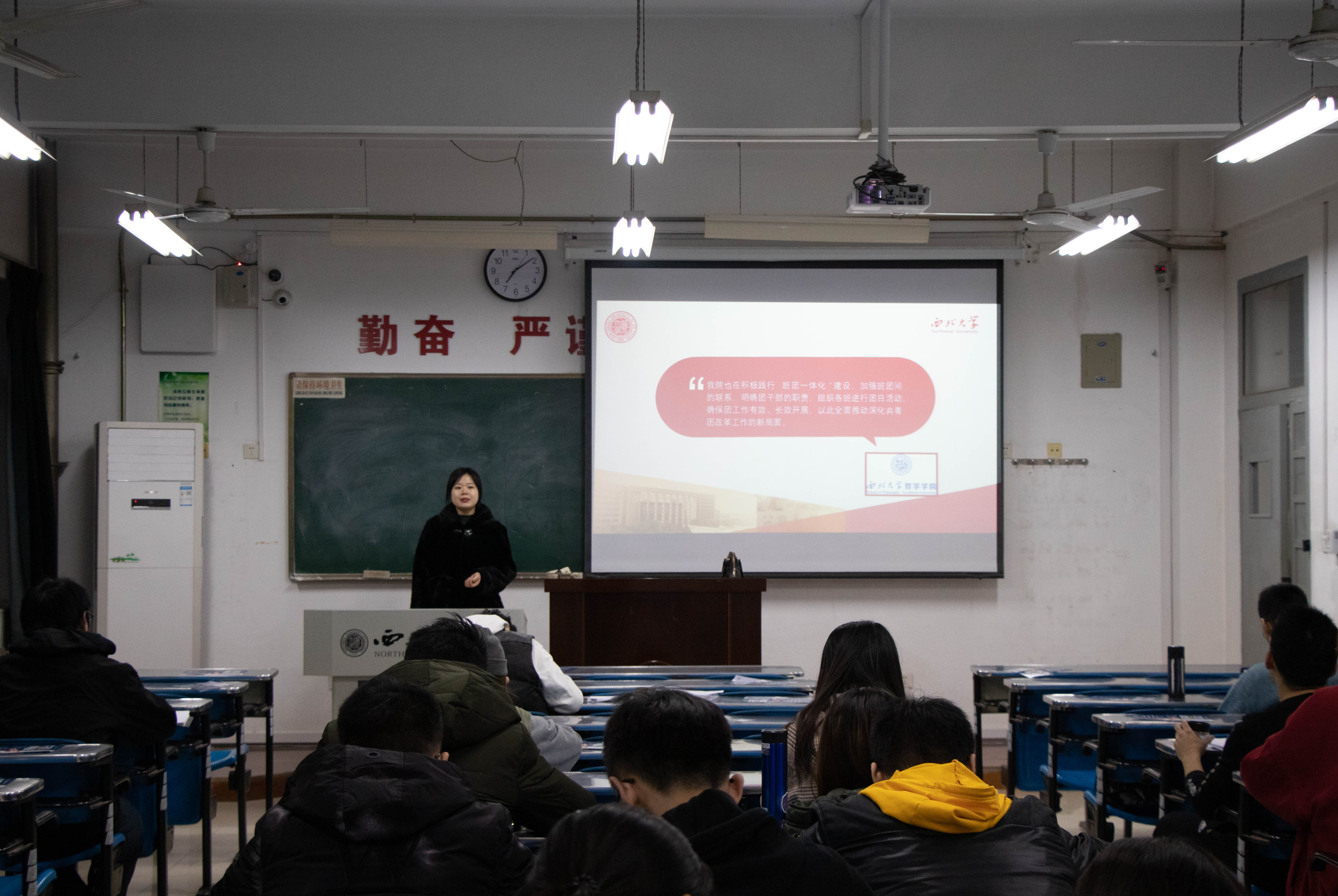 2019年12月17日晚,437必赢会员中心本科2018级哲学与社会工作团支部在1205教室召开了“班团一体化政策学习”主题团课,邀请到院团委书记李鑫老师为大家上团课。本次团课旨在促进团支部的凝聚力,引导同学们进一步深入了解“班团一体化”,积极投身“班团一体化建设”