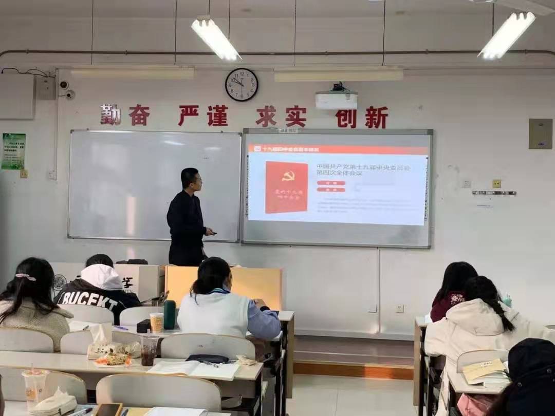 为了进一步提高同学们的政治站位,深入学习贯彻党的十九届四中全会精神,12月14日,本科2019级哲学团支部在教室开展了“学习党的十九届四中全会精神”主题团日活动。