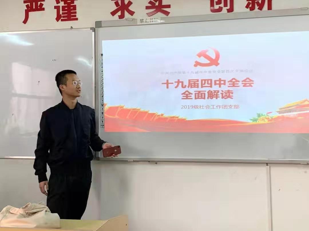 12月18日,本科2019级社会工作团支部在3302教室开展了“学习党的十九届四中全会精神”主题团日活动。本次活动由团支书马偲员及团副支书何思远同学主持,支部全体团员到场参加。